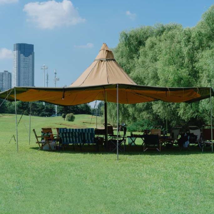 広々とした空間が魅力の大型ティピー型テント。キャンプ愛好家に最適な開放的な日よけ付きデザイン。