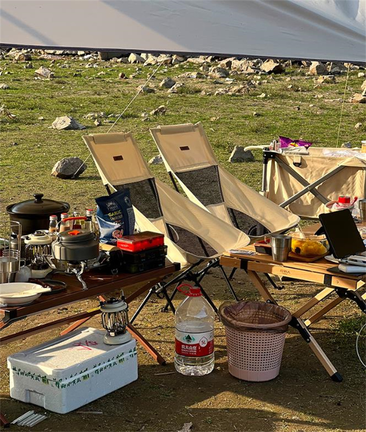 野外の不整地に対して、椅子を安定させて倒れにくいようにしますアウトドアを楽しみ、快適な自然を楽しみ、生活体験アウトドアを愛する