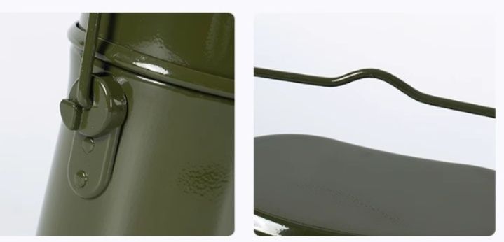 持ち運びに便利な吊り下げ用の取っ手付きで、キャンプ用品としての実用性が高く、火にかけても使える耐熱性を備えています。